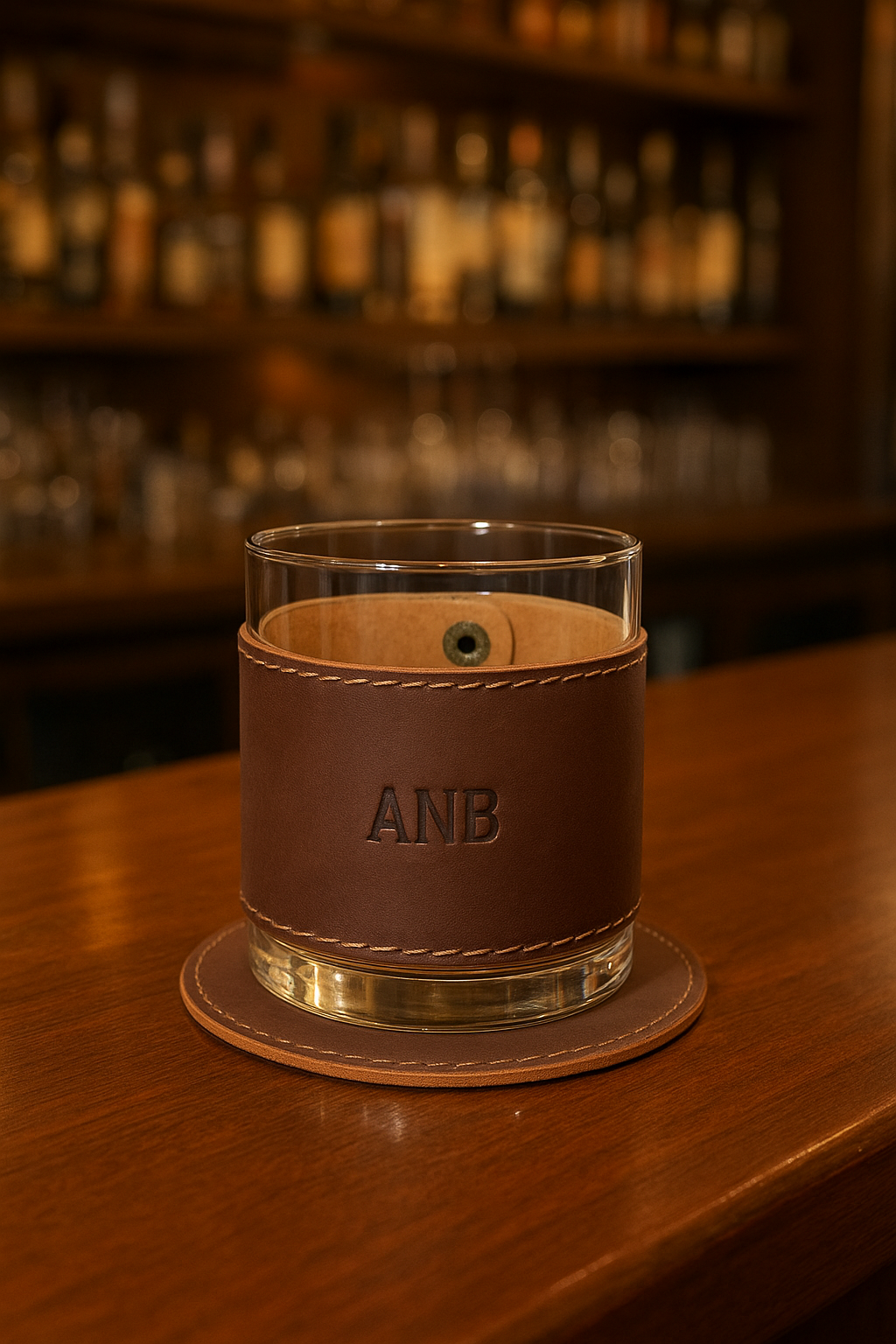 Upgrade your barware collection with our Rocks Set, which can be personalized with names, initials or dates. This set includes a sleek rocks glass, leather sleeve, and leather coaster for a sophisticated drinking experience. Protect your furniture and elevate your drinks with this high-quality set.