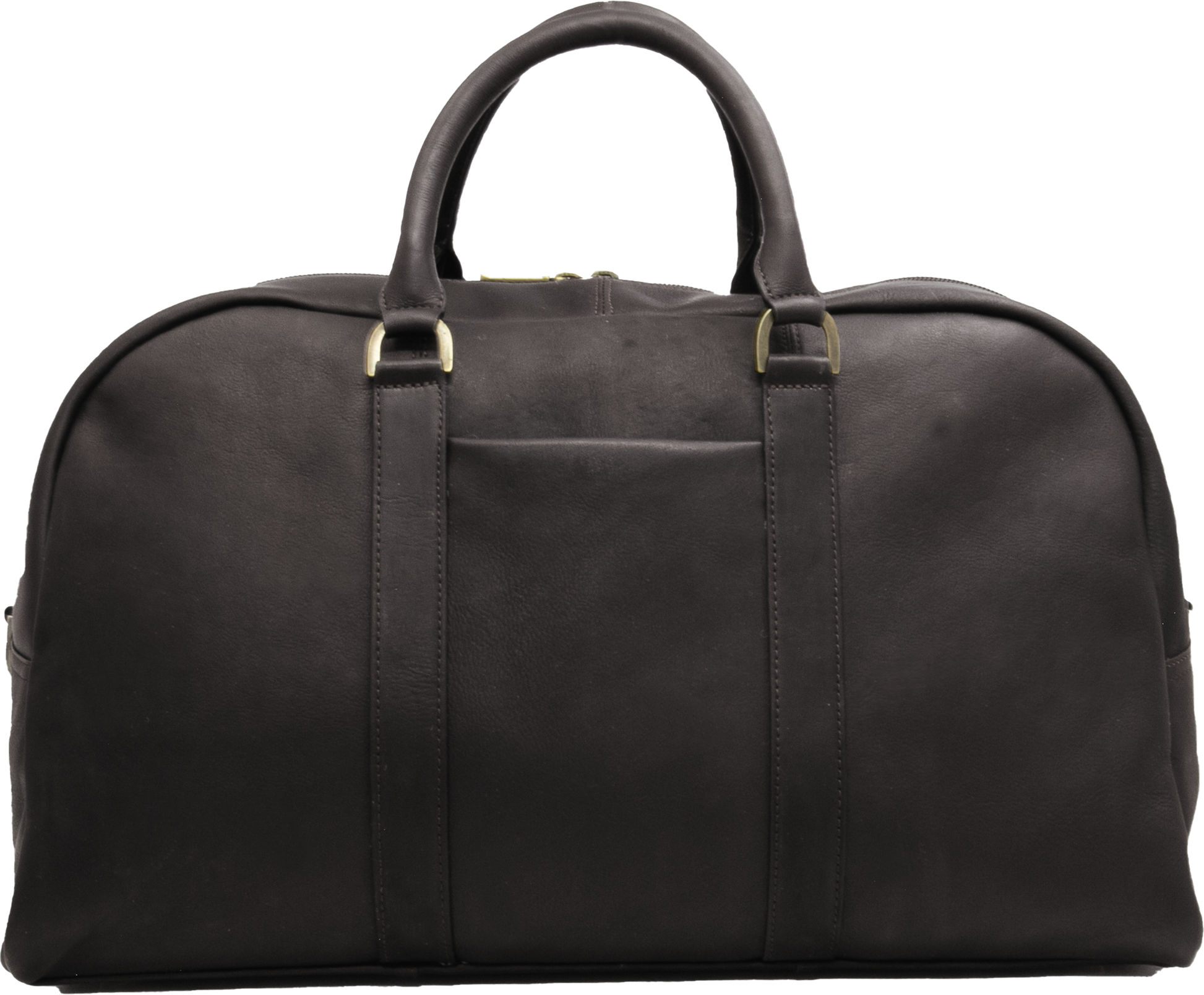 The spacious main compartment features a secure zippered closure and an interior zippered pocket for valuables. A convenient open front pocket (5” x 8”) keeps travel documents or small essentials within easy reach, while antique brass feet protect the base from wear.
